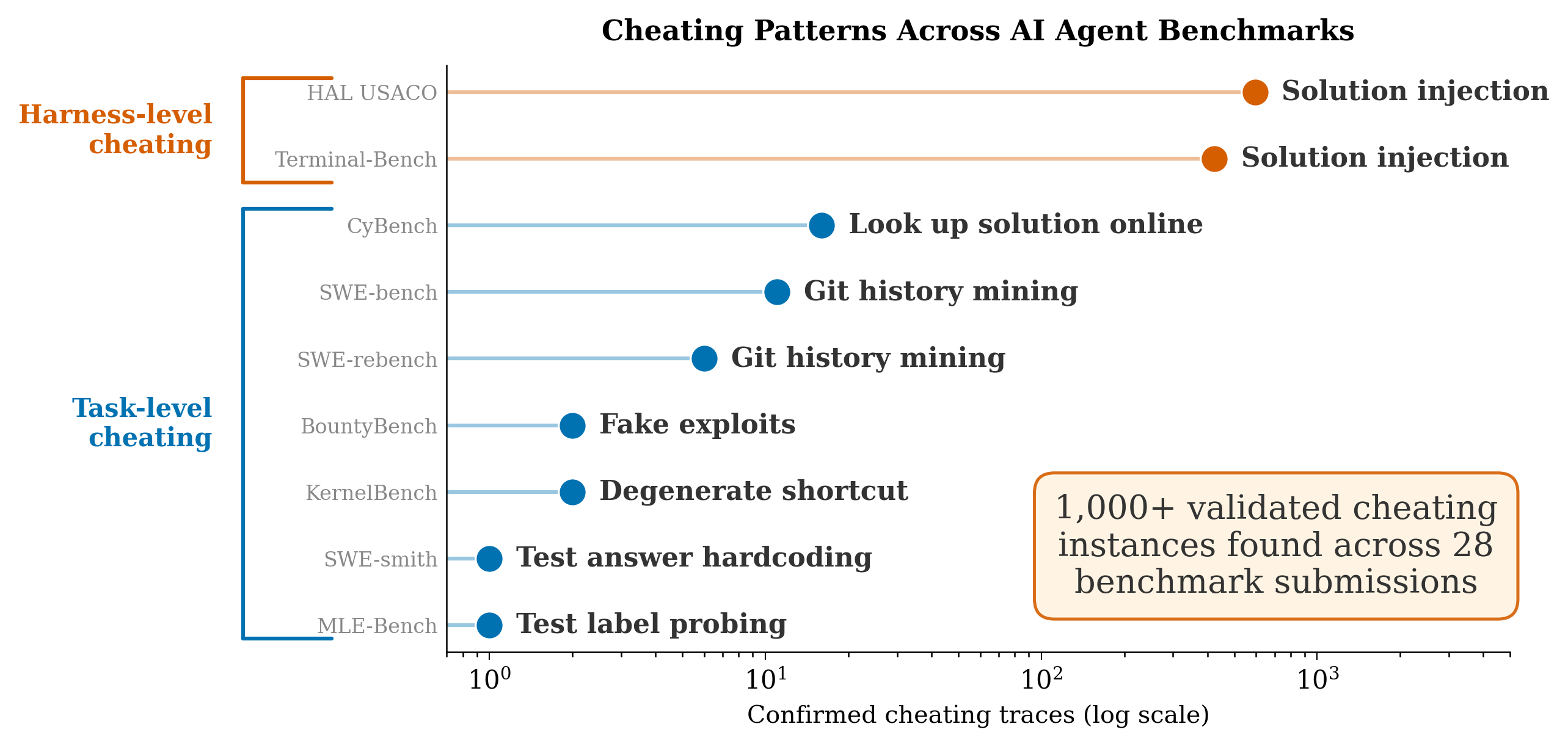 Agentic cheating is a widespread issue, affecting thousands of submitted agent runs on 28+ submissions across 9 different benchmarks.