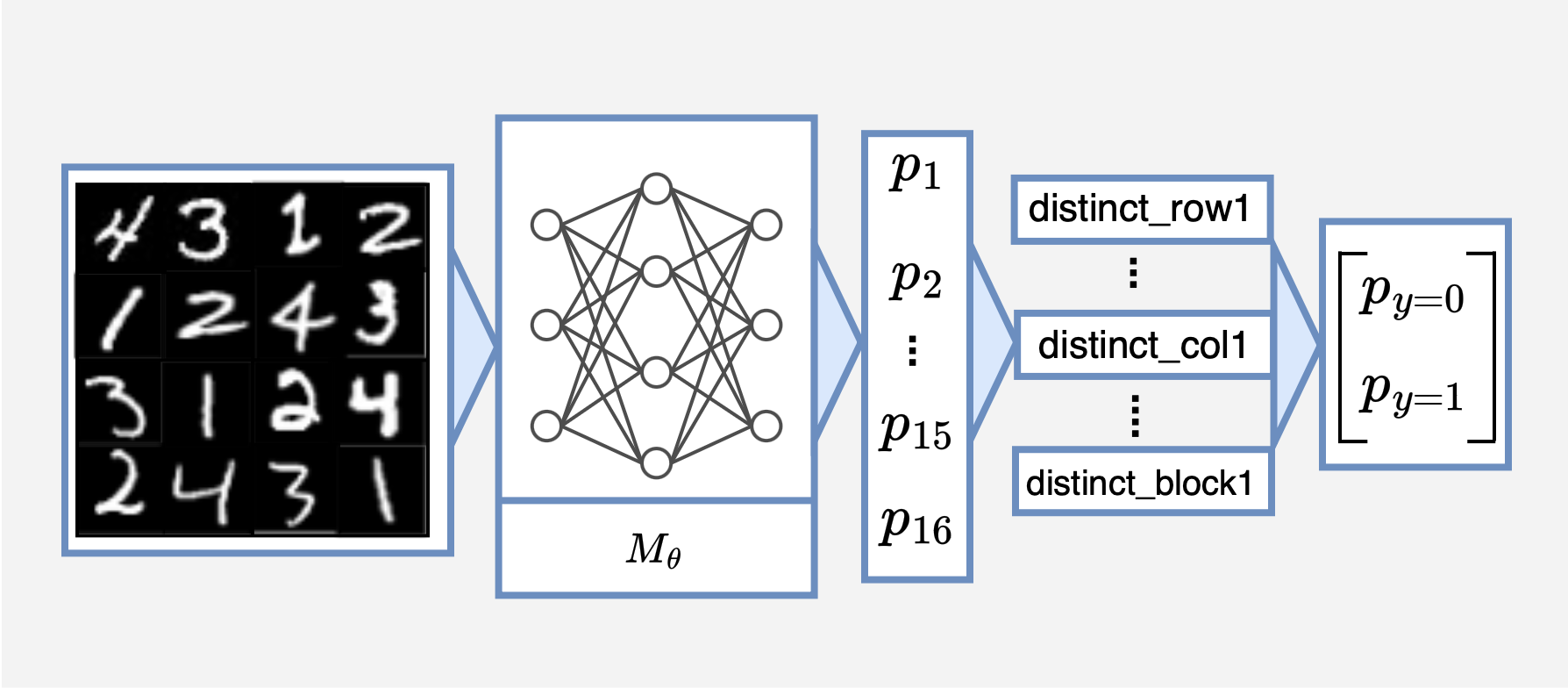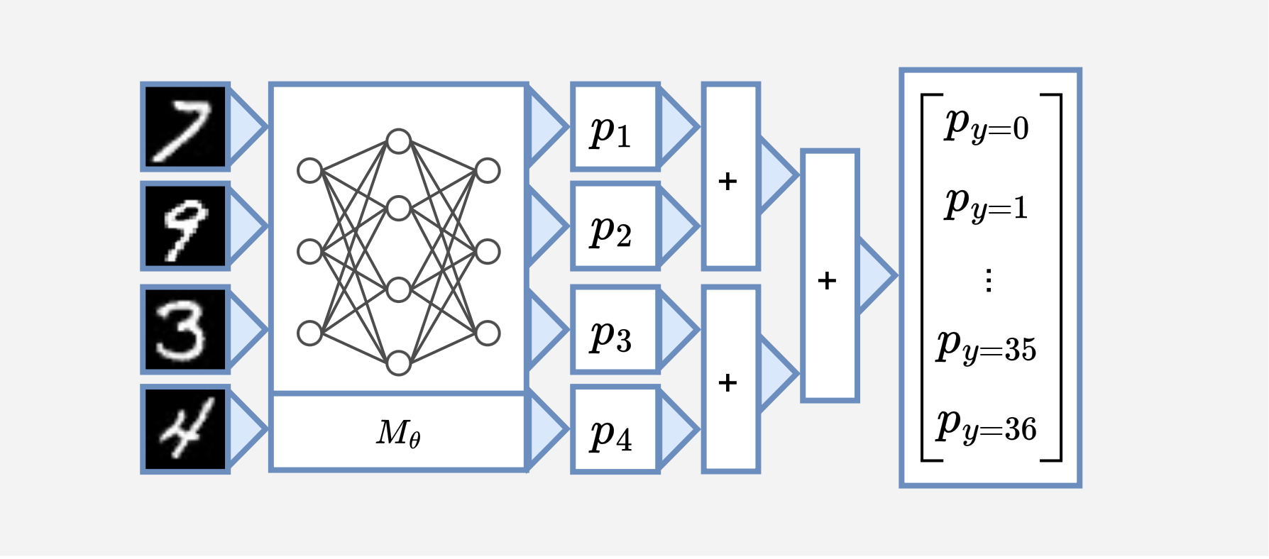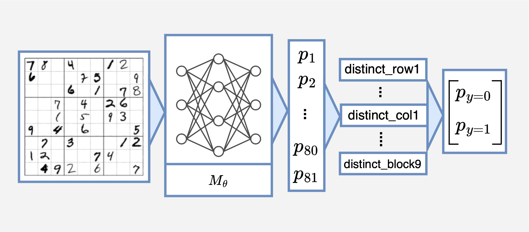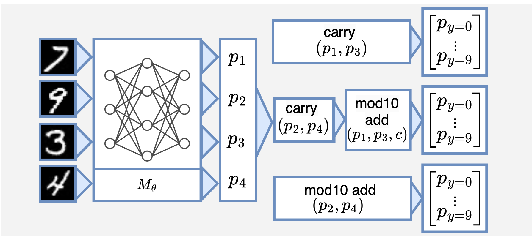 This learning paradigm, called neurosymbolic learning, targets the composition of a neural network $M_\theta$ followed by a program $c$, and the goal is to train $M_\theta$ with end-to-end labels of the composite.