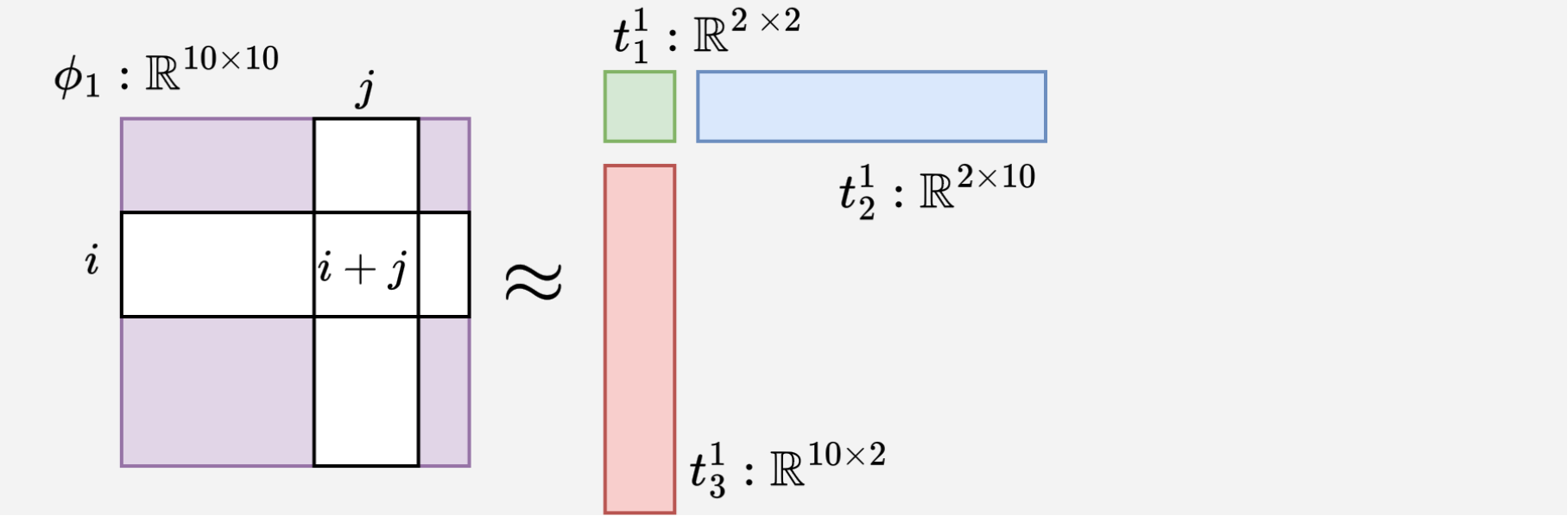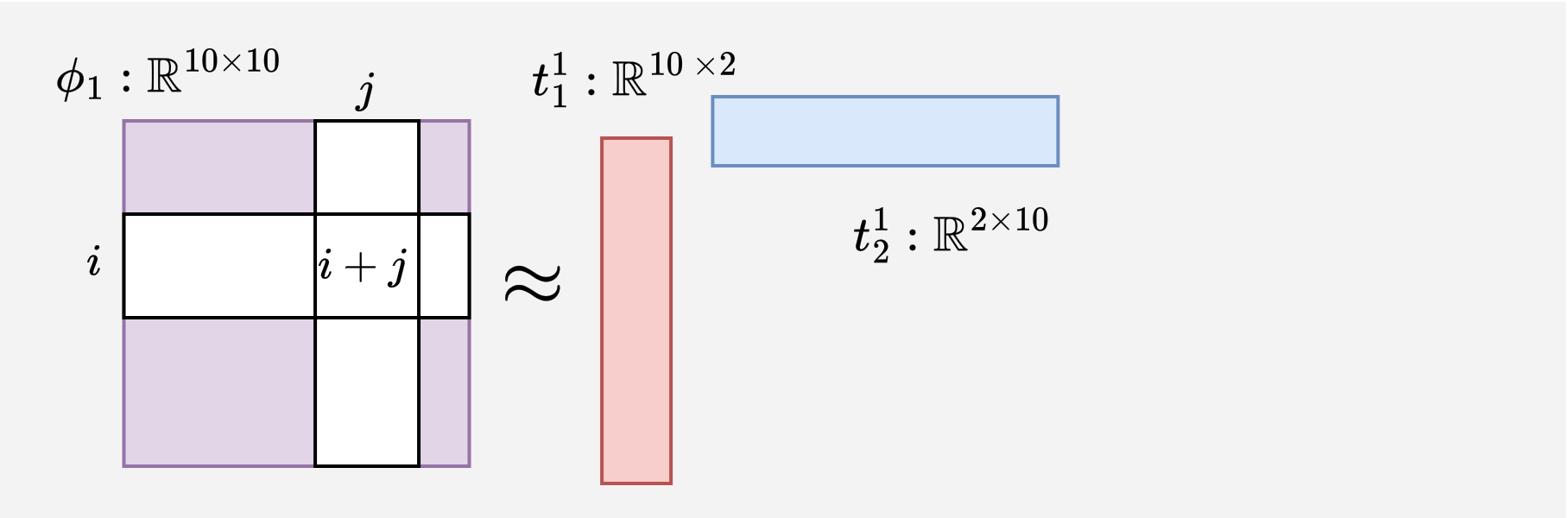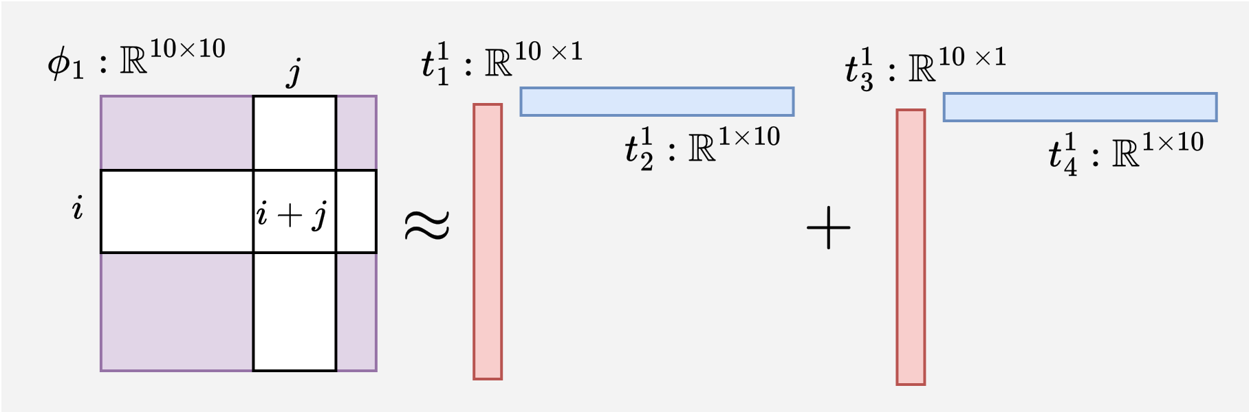 For sum-4, we apply TT-SVD with the decomposition rank configured to 2 and obtain two sketches $t_1^1 : \mathbb{R}^{10 \times 2}$ and $t_2^1 : \mathbb{R}^{2 \times 10}$ for $\phi_1$.