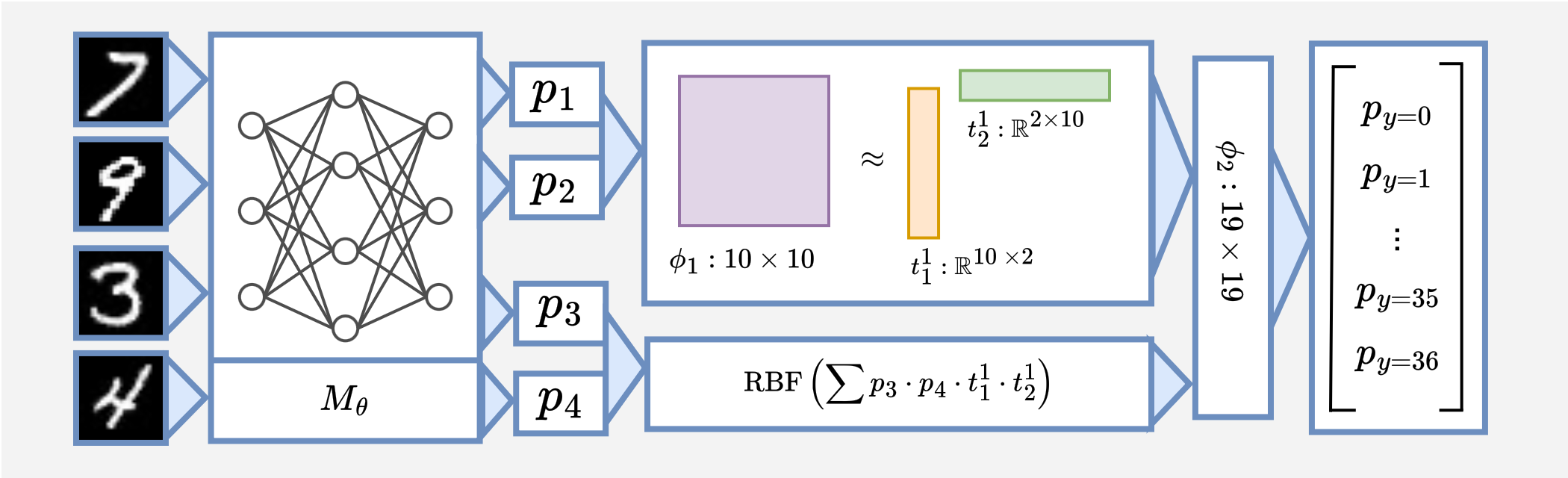 \[v = \sum_a^{10} \sum_b^{10} \sum_x^2 p_1[a] p_2[b] t_1^1[a, x] t_2^1[x, b] \\ = \sum_x^2 \left(\sum_a^{10} p_1[a] t_1^1[a, x]\right) \left(\sum_b^{10} p_2[b]t_2^1[x, b]\right) \\ = (p_1^{\top} t_1^1) \cdot (t_2^1 p_2)\]Then, we apply RBF kernel and $L_1$ normalization to transform the value $v$ into a probability distribution. For each output value $j$, we use the following formula: